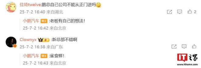 小鹏汽车官方还与网友进行互动,针对网友提出的“鹏总自己公司不能从正门进吗”疑问,官方回复称“老板有自己的想法”。