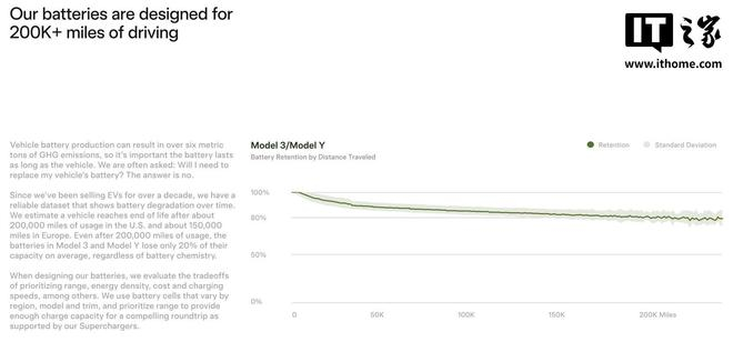 数据显示,在特斯拉大规模销售电动汽车的大约十年时间里,特斯拉电动汽车的电池在平均行驶里程达到 20 万英里(IT之家注:约 32.19 万公里)时,其容量会降至原始容量的 80%,无论电池化学成分如何。