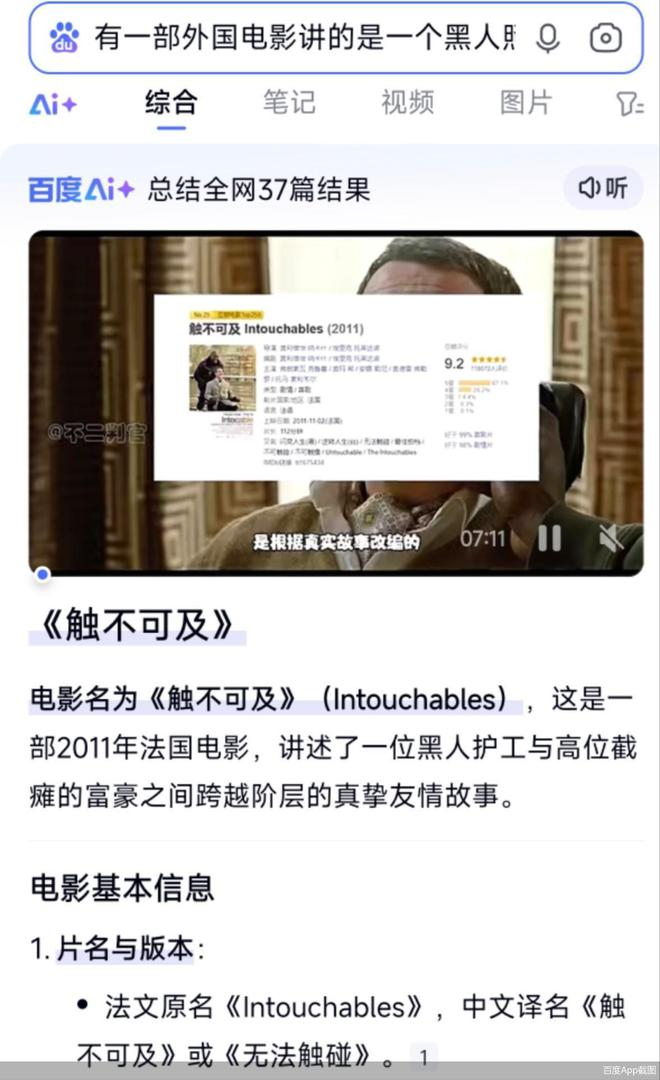 她这样举例,"有一部外国电影讲的是一个黑人照顾一个残疾人,残疾人是一个富豪,电影名是什么,谁拍的",当用户输入上述模糊需求,百度搜索会直接给出答案:《触不可及》。搜索结果页也出现变化,比如用户提问"最近有什么适合送礼的数码产品","以前百度搜索会给出一堆链接,现在可以帮用户把信息分门别类整理好,同时支持搜索页直接下单",陈颖梅说。