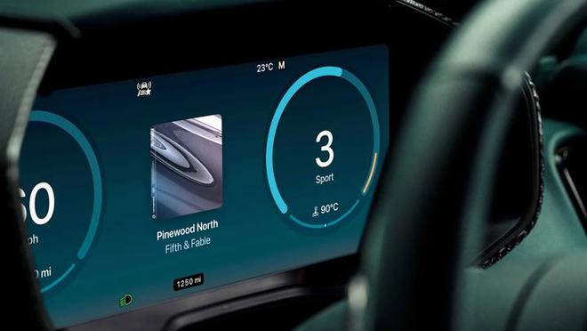 仪表盘的革新,是此次升级的重头戏。它提供了类似 Apple Watch 表盘的切换逻辑,用户可以通过方向盘上的按键,在阿斯顿·马丁标志性的「双圆盘」经典主题、苹果风格的极简线条,或是全屏地图导航等多种模式间自由切换。