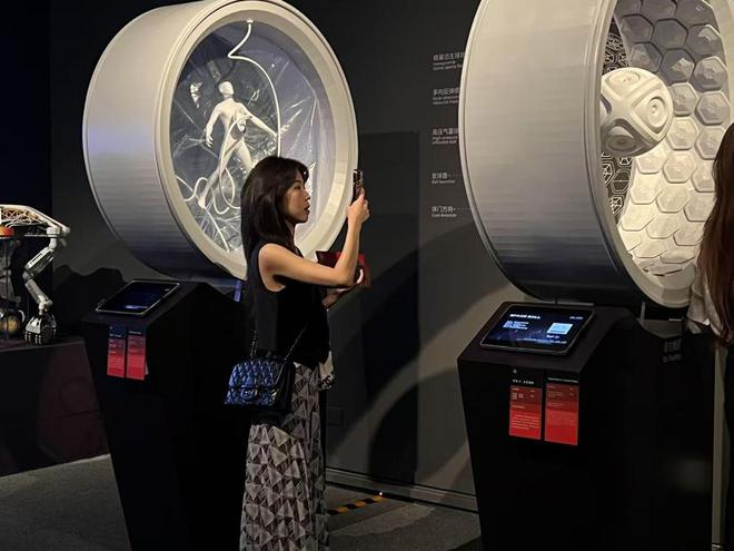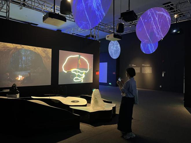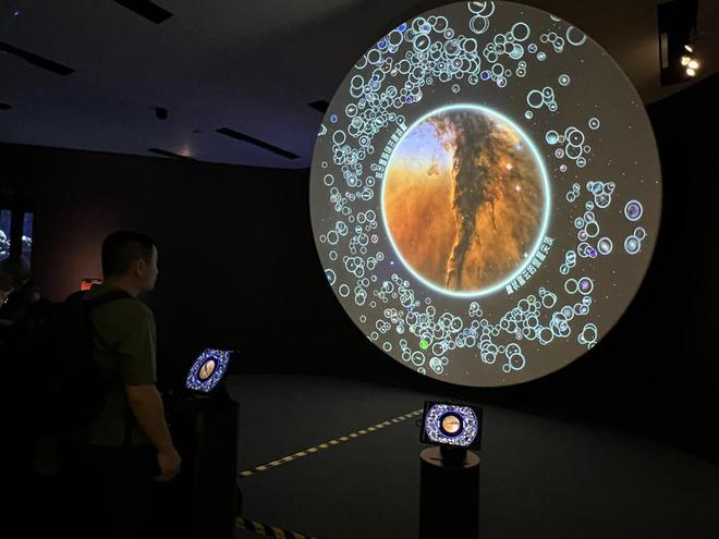 人类一直在仰望天空,思索穿行苍穹的星辰。展览中,由瑞士洛桑联邦理工学院实验博物馆学实验室设计的交互装置《宇宙碰撞》吸引了大量观众。《宇宙碰撞》是一套集成于碟形环境的交互式天体物理可视化系统,以美国国家航空航天局(NASA)望远镜采集的约500幅深空影像为数据基础,借助碟形顶投影、光学增强模块等技术,使螺旋星云结构、星系碰撞过程等天体现象可视化呈现。观众沉浸于重构的天幕空间中,既是一种信息体验,也是一种沉思,将我们与宇宙更紧密地联系在一起。