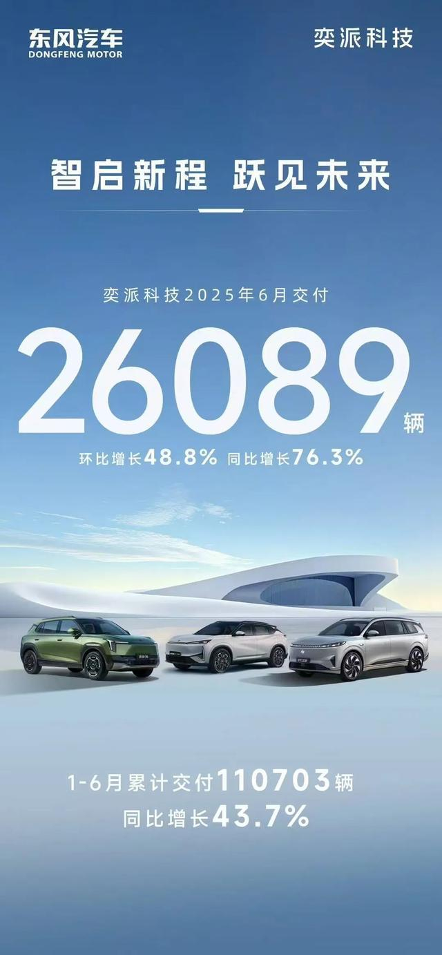 东风奕派延续黑马态势,6月销量26089辆,同比增长76.3%,上半年累销超11万辆,同比增43.7%,凭借高性价比策略快速抢占市场。