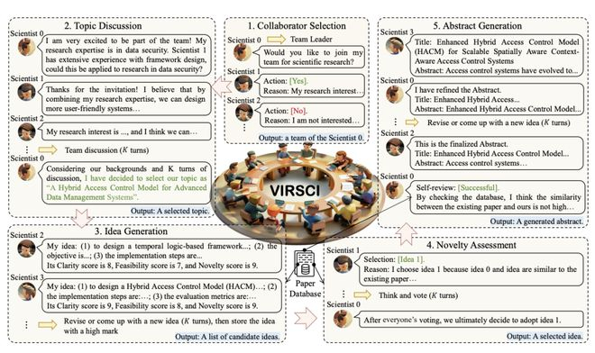 据团队介绍,VIRSCI包括五个关键步骤:合作者选择、选题讨论、点子生成、新颖性评估和摘要生成。