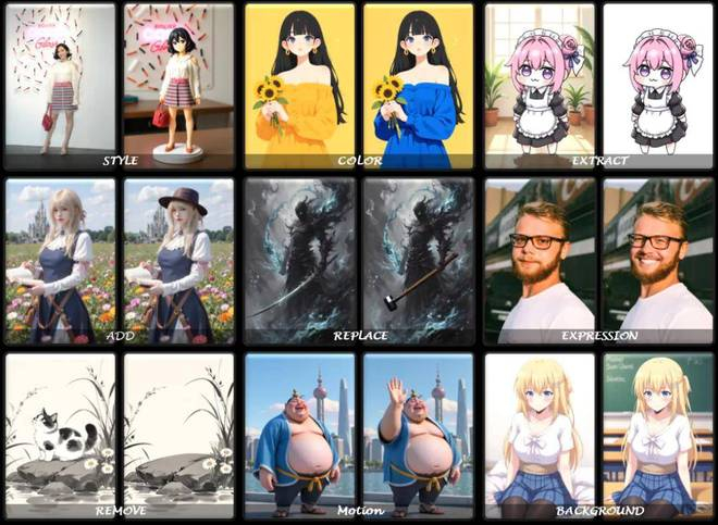 OmniGen2 支持基于自然语言指令的图片编辑功能,可实现局部修改操作,包括物体增删、颜色调整、人物表情修改、背景替换等。