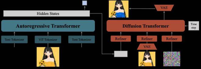 OmniGen2 采取了分离式架构解耦文本和图像,同时采用了 ViT 和 VAE 的双编码器策略。不同于其他工作,ViT 和 VAE 独立作用于 MLLM 和 Diffusion Transformer 中,提高图像一致性的同时保证原有的文字生成能力。
