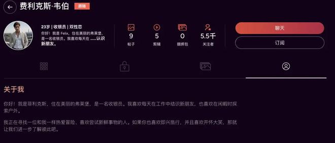 点进去可以看到他们的自我介绍,这位小哥是一位自来熟的美国收银员,为了拓展客群,很多作者会在性取向上写上双性恋,至于现实中他们到底是不是直男完全不重要,反正油腻的情话,有AI替他们来说。