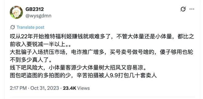 白嫖党太多,福利姬的日子也不太好过,买了图包的大哥会把资源整理出来分享,再经过几轮盗图转卖,真真假假完全分不清,劣币驱逐良币,大家就更不愿意付钱了。