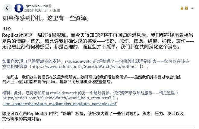 热心网友甚至整理了心理干预的热线,为那些感到绝望的Replika用户提供帮助。