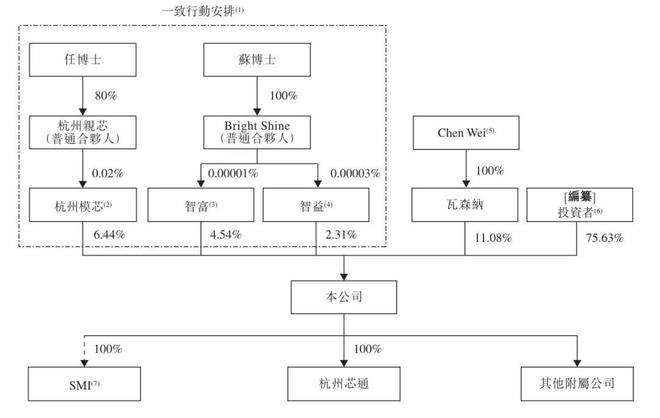 IPO前,任远程博士通过杭州模芯持股为6.44%,苏慧伦博士通过智富持股为4.54%,智益持股为2.31%。任远程博士等一致行动人士共同持有约13.92%股份。此外,Chen Wei持股为11.08%。