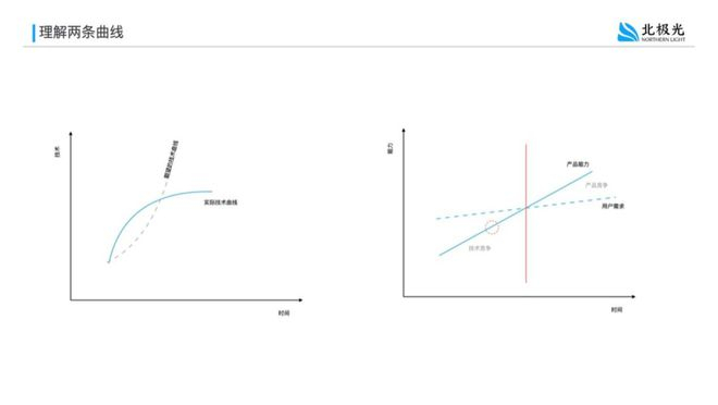 长期以来,许多人受到互联网时代“指数级增长”神话的影响,误以为技术演进必然是持续加速的,就如左图中那条虚线所示。
