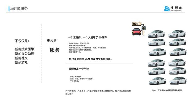 例如,在旧金山湾区,一位来自大型科技公司的员工利用大模型自建了一个用于管理其 80 辆 Tesla 租赁业务的智能客服系统。该系统几乎实现了全流程自动化:用户在线提交驾照及个人信息,系统自动审核并分配取车位置;到达后车辆自动解锁;还车时,系统完成电量检测与车况评估。这一切得以实现,既得益于租车本质上就是标准化的客服流程,也因为 Tesla 开放了 SDK,使整个流程具备高度的可编程性和自动化能力。
