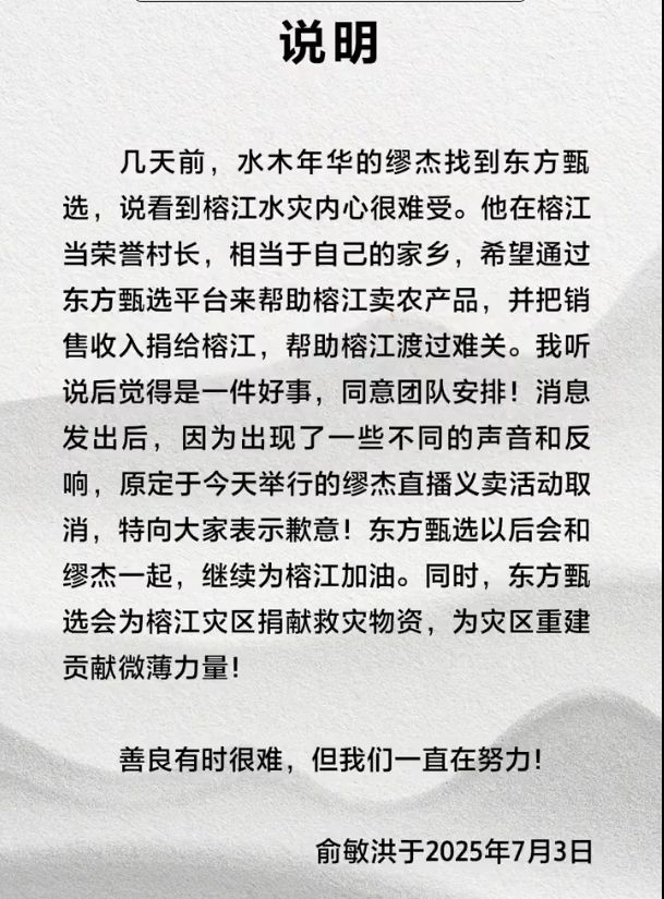声明中,俞敏洪表示:“几天前,水木年华的缪杰找到东方甄选,说看到榕江水灾内心很难受。他在榕江当荣誉村长,相当于自己的家乡,希望通过东方甄选平台来帮助榕江卖农产品,并把销售收入捐给榕江,帮助榕江渡过难关。我听说后觉得是一件好事,同意团队安排!消息发出后,因为出现了一些不同的声音和反响,原定于今天举行的缪杰直播义卖活动取消,特向大家表示歉意!东方甄选以后会和缪杰一起,继续为榕江加油。同时,东方甄选会为榕江灾区捐献救灾物资,为灾区重建贡献微薄力量!善良有时很难,但我们一直在努力!”