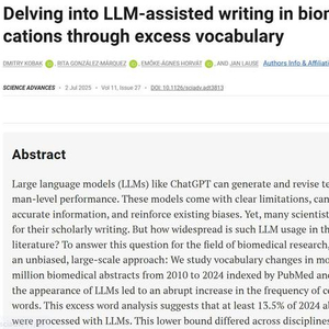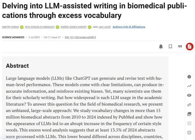 论文的第一作者,蒂宾根大学Hertie人工智能研究所数据科学系的课题组负责人Dmitry Kobak博士表示,看到如此多的论文摘要——通常是大多数人唯一阅读的成果总结,使用AI生成,着实令人感到惊讶。他感叹称:“像论文摘要这么重要的内容,你不应该那么做。”