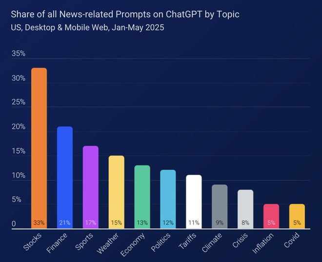 最受欢迎的提示词主题包括股票(33%)、金融(21%)、体育(17%),可见AI分发已深度嵌入多行业的用户搜索路径。