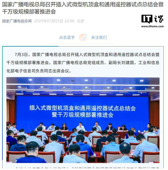 IT之家 7 月 3 日消息,国家广播电视总局今日召开插入式微型机顶盒和通用遥控器试点总结会暨千万级规模部署推进会。国家广播电视总局党组成员、副局长刘建国,工业和信息化部电子信息司负责同志出席会议。