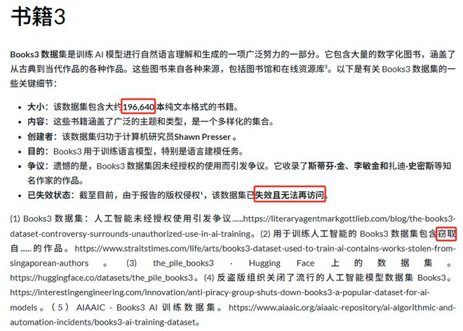 Books3 是一个包含 196640 本 txt 的数据集,里面偷了不少盗版书。几乎所有大模型都用它做训练,不过数据集明面上很早就被下架,变成了不能说的秘密。