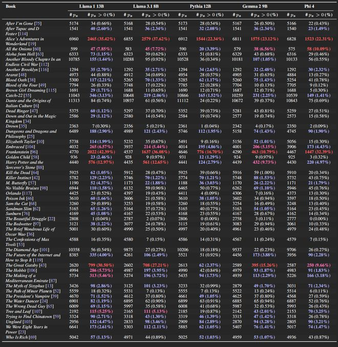 除了 Llama,Pythia、Gemma、Phi 也在这不恰当的时刻展示出了它们惊人的记忆力。文章里只列出来了 100 本被记住的书,实际上它们背得更多。