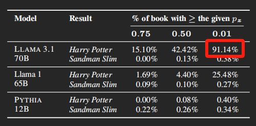 这么一来一回,实验结果表示,《 哈利波特与魔法石 》有 91.14% 的内容都能被 Llama 记住,再给你原封不动地背出来。