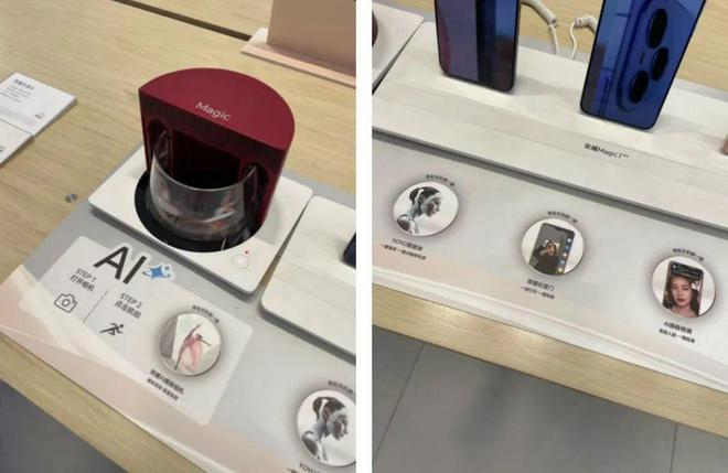 眼下,AI叙事成为市场想象力的核心,荣耀也把宝压在了AI上。在浙江一家荣耀门店,《豹变》看到,入口C位的桌上,摆放着几台荣耀Magic7系列手机,一旁的宣传物料指导顾客使用AI功能。例如,AI鹰眼相机可以抓拍快速旋转的画面;支持图片一拖打印、一圈购物;用AI修图,拯救废片等。这在其他品牌门店并不多见。