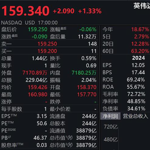 隔夜美股市场上,英伟达股价一度上涨2.4%至160.98美元,市值超过苹果公司在2024年12月26日收盘价创下3.915万亿美元的历史新高。截至美股收盘,英伟达上涨1.33%报159.34美元,市值3.89万亿美元。