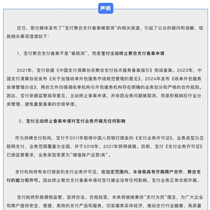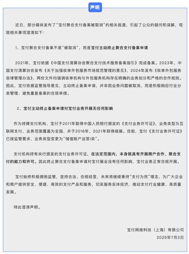 7月3日,宝付网络科技(上海)有限公司发布澄清声明称,宝付聚合支付备案不是“被取消”,而是宝付主动终止聚合支付备案申请。宝付依据监管指导意见,主动终止备案申请,并非因业务问题被取消,而是积极响应行业分类管理、避免重复备案的合规举措。宝付表示,终止聚合支付备案申请对宝付展业没有任何影响,宝付业务正常合规开展。