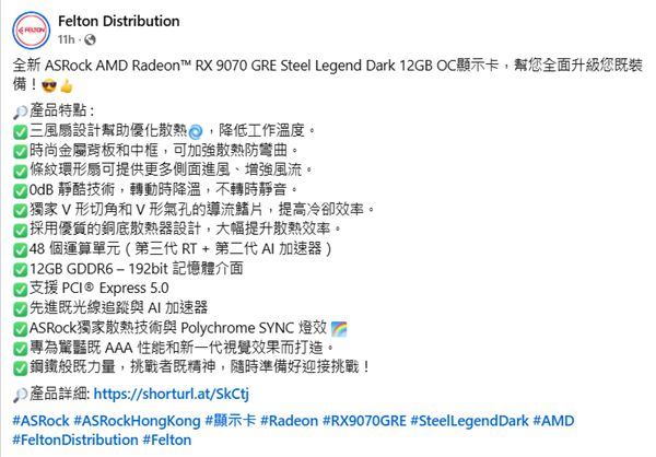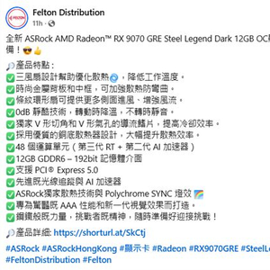 前不久蓝宝石将其带到了中国台湾市场,根据香港知名电脑商店Felton Distribution的消息,其销售范围进一步扩大,即将在香港地区上市ASRock Radeon RX 9070 GRE Steel Legend Dark 12GB OC版本。