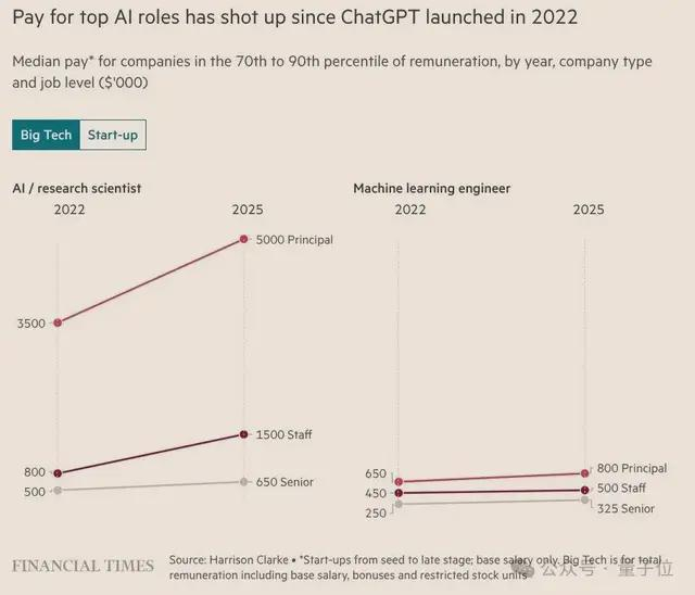 从2022年到2025年,不管是大科技公司还是初创公司,这些顶尖技术人员的薪资涨幅都有了大幅提升。