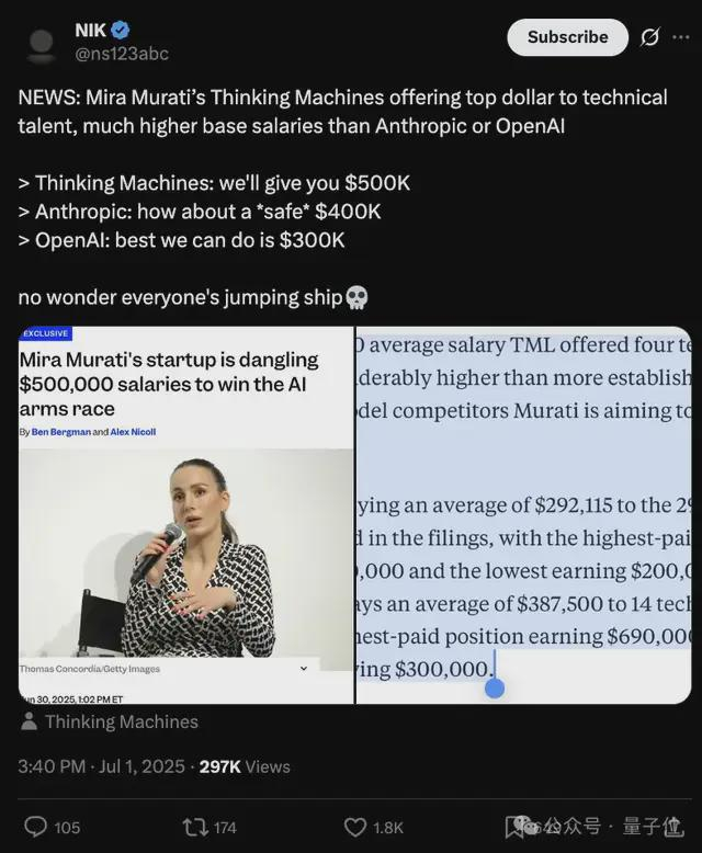 她能给到技术人员的薪资可以达到50万美金。相较之下,Anthropic给40万,OpenAI给的30万,Mira Murati可以说是相当豪横了。