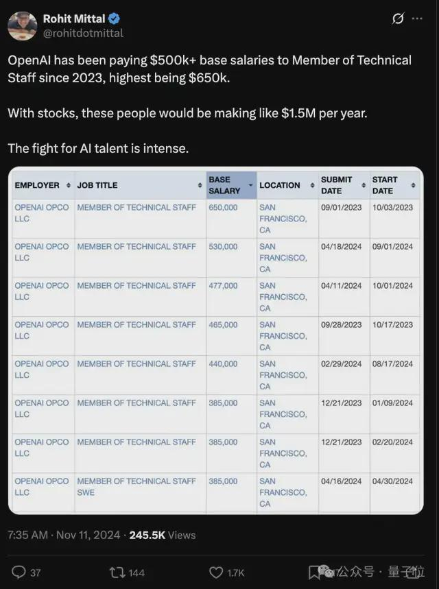 去年11月曾爆料,OpenAI自2023年起,一直向技术人员支付50万美元以上的基本工资,最高可达65万美元。如果加上股票,这些人的年薪将达到150万美元。