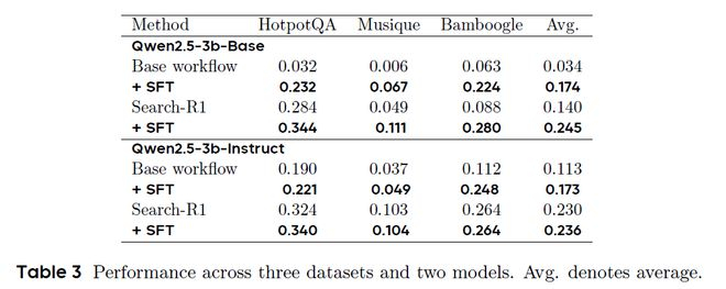其次,研究团队进一步评估了TaskCraft 所生成任务数据在提升大模型能力方面的实际效果。以 Qwen2.5-3B 系列为基础,研究者基于三个典型的多跳问答数据集(HotpotQA、Musique 和 Bamboogle)的训练集,生成了约32k条多跳任务以及轨迹,并利用这些生成数据对模型进行监督微调(SFT)。如表2,实验结果表明,经过微调后,Base 模型的平均性能提升了 14%,Instruct 模型提升了 6%,说明 TaskCraft 生成的数据在增强大模型的推理能力与工具调用表现方面具有显著成效。此外,当这些微调模型与强化学习方法 Search-R1 相结合时,模型性能进一步提升,进一步证明 TaskCraft 所生成的任务数据不仅能用于监督学习,也可作为强化学习的优质训练起点。