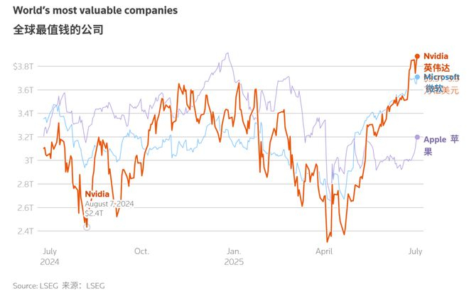 这还不够,就在昨天,英伟达盘中一度超越苹果公司的纪录,市值直逼4万亿美元!