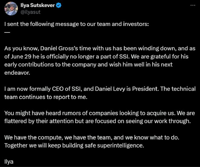 在一则推文中,伊利亚宣布SSI联合创始人兼CEO丹尼尔·格罗斯(Daniel Gross)自当地时间6月29日起已经不再是SSI的一员,而伊利亚本人将亲自接任SSI CEO一职。格罗斯原本在SSI主要负责算力、筹款和人才引进的工作。另据彭博社报道,格罗斯的发言人称,格罗斯将在Meta超级智能实验室从事AI产品研发工作。