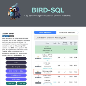 在这个以真实业务数据库为基础的测试中,覆盖金融、医疗、体育等37个行业场景,数据库总容量达33GB,查询问题超过1万条。TCDataAgent在官方不公开数据集的封闭测试环境下,最终获得了75.74分,位居全球第三, 国内第一。