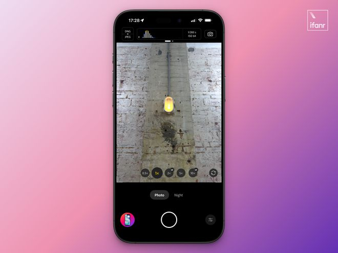 视线转向屏幕的下半部分,在取景框的底部,是我们熟悉的焦段选择栏,以我的 iPhone 16 Pro 为例子,Indigo 分别提供了 0.5×、1×、2×、5×、10× 这五个选项。