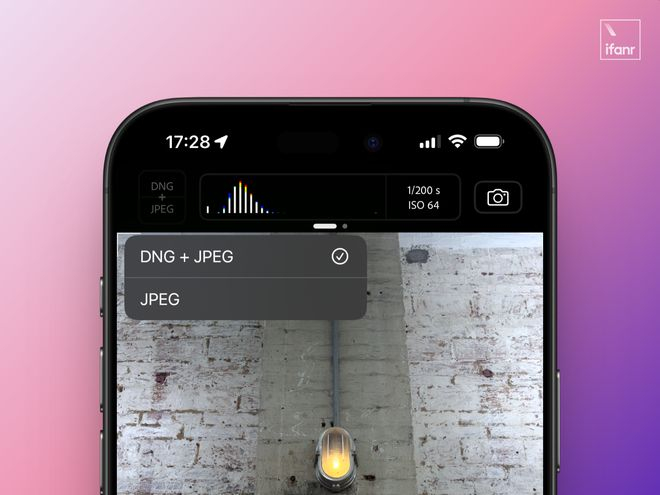 从顶部开始看,这里分为图片格式、直方图与曝光参数、拍摄模式三个部分,图片格式允许你选择拍摄 JPEG 格式的照片或是 DNG+JPEG 格式。