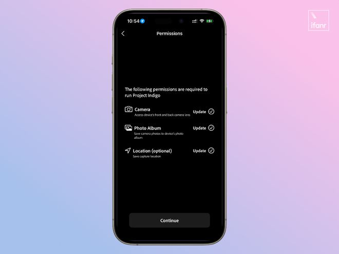 进入 Project Indigo(后文简称为 Indigo),首先是熟悉的权限请求界面,这个影像 app 总共需要三个权限: