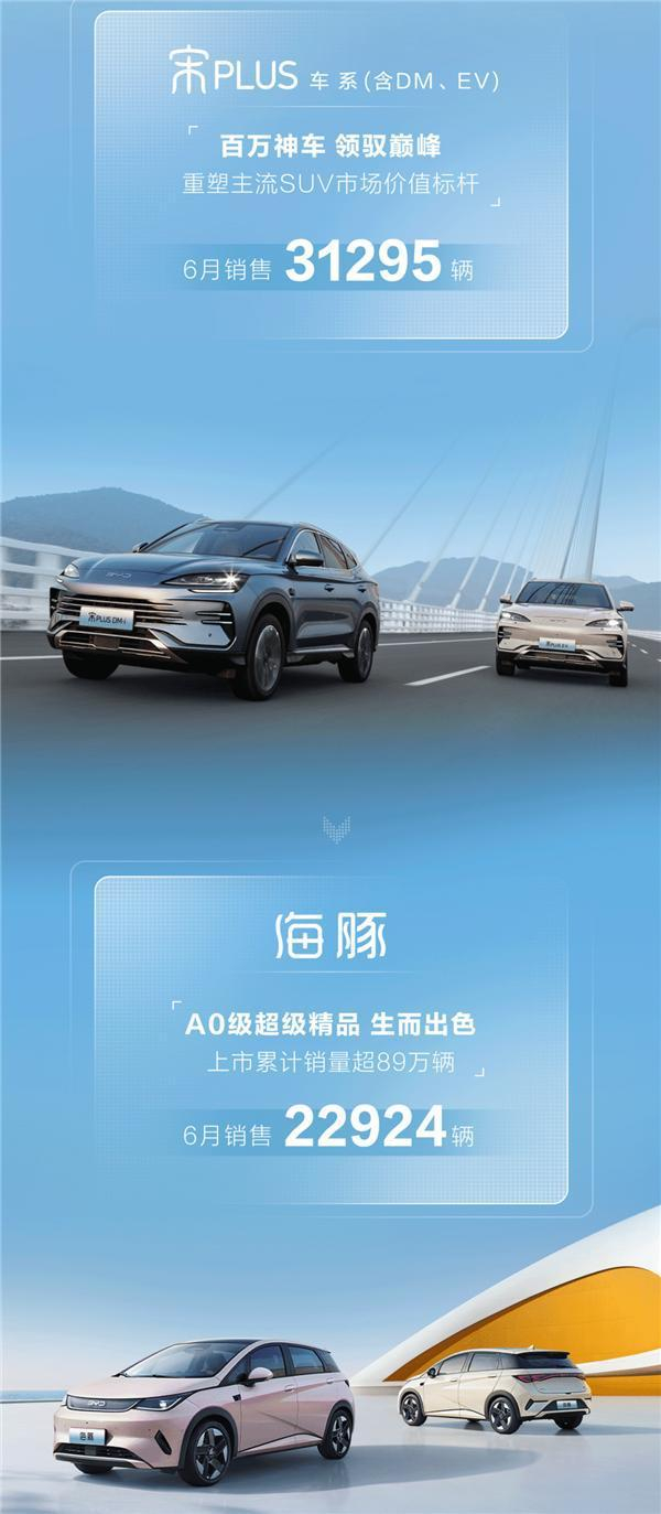 宋PLUS系作为“百万神车”,6月贡献31295辆销量;海豚作为A0级精品,上市累计超89万辆,6月也有22924辆进账。