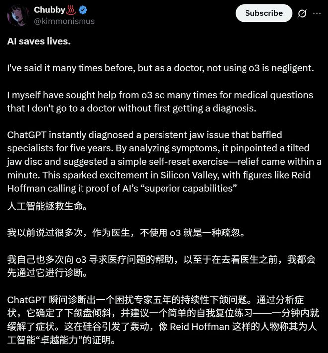 X上另一位医生分享,她经营一家诊所,AI的崛起正深刻改变医疗实践。