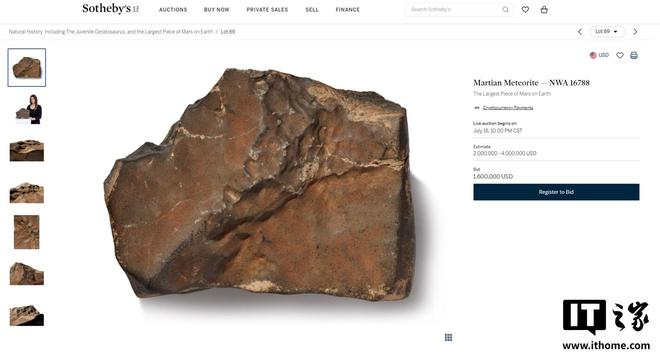 如图所示,地球上已知最大的火星陨石 NWA16788 上架苏富比拍卖行,将于 7 月 16 日在纽约开启专场拍卖,预估成交价 200~400 万美元(IT之家注:现汇率约合 1433.4 ~ 2866.9 万元人民币)。