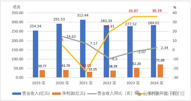 尽管在线音乐收入保持增长,但公司整体营收增速却显露疲态。2024年,腾讯音乐实现营业收入284.01亿元,同比增长仅为2.34%,相较于2022年和2023年分别为-9.3%和-2.07%的同比降幅虽有所改善,但仍难掩其增长乏力的态势。与之形成对比的是,净利润端表现相对亮眼,2024年公司实现净利润71.09亿元,同比增长36.19%,连续三年保持两位数增长。