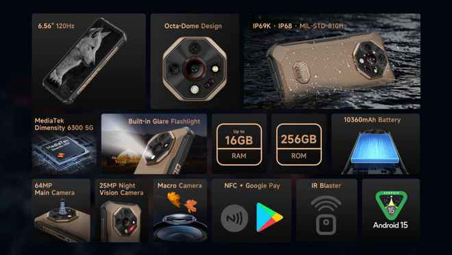Armor X16 Pro 配备 6.56 英寸屏幕,支持 120Hz 高刷新率;搭载联发科天玑 6300 5G 芯片,最高支持 16GB 内存和 256GB 存储。