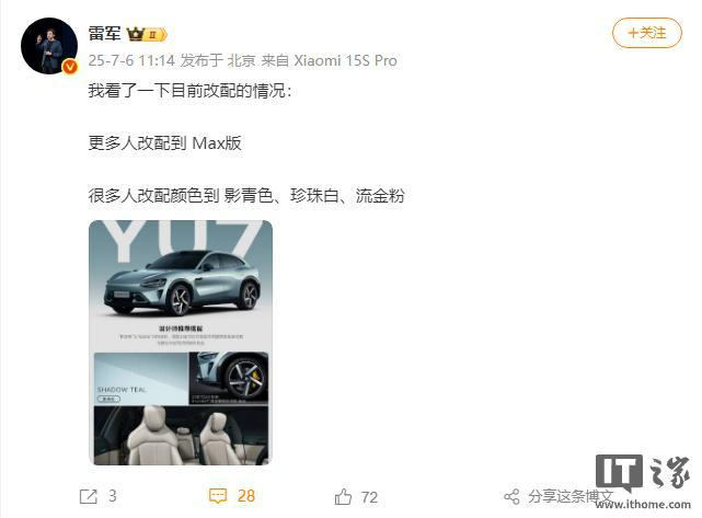 IT之家 7 月 6 日消息,小米 YU7 今天上午 10 时起开启限时改配,小米创办人、董事长兼 CEO 雷军在微博上披露了当前的改配情况:更多人改配到 Max 版,很多人改配颜色到影青色、珍珠白、流金粉。