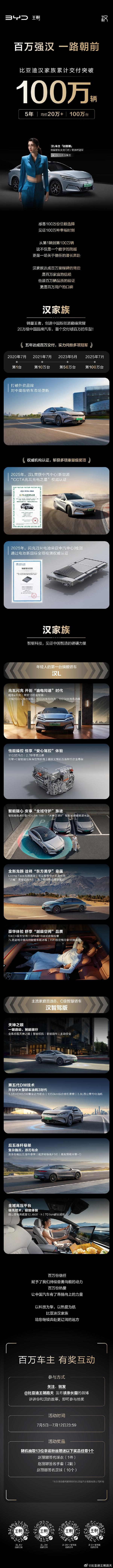 从时间线看,2020年7月首台车交付,到2025年7月达成百万辆,汉家族走过了五年历程。