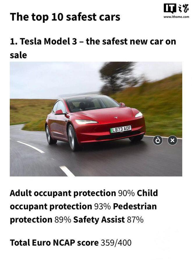 IT之家 7 月 6 日消息,在新车安全评鉴协会(Euro NCAP)的最新测试结果中,特斯拉 Model 3 被评为 2025 年市场上最安全的新车。此次共有 20 款新车型接受测试,Model 3 以 359 分的高分脱颖而出,接近满分 400 分,在所有主要安全类别中均表现出色。