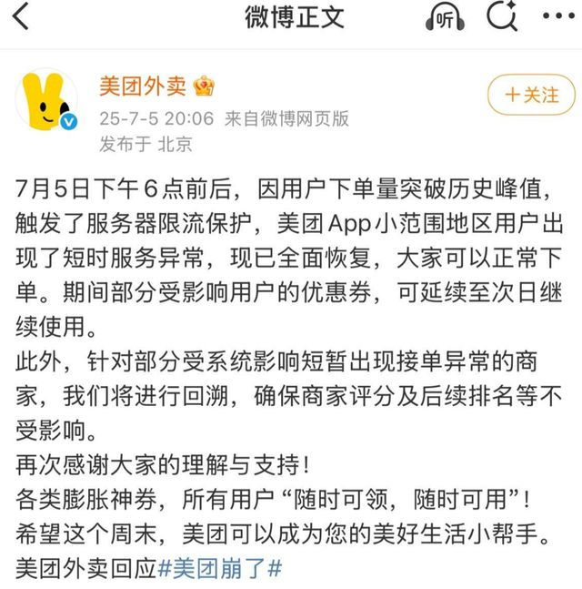 昨晚8点多,美团回应称:7月5日下午6点前后,因用户下单量突破历史峰值,触发了服务器限流保护,美团APP小范围地区用户出现了短时服务异常,现已全面恢复,大家可以正常下单。其间部分受影响用户的优惠券,可延续至次日继续使用。