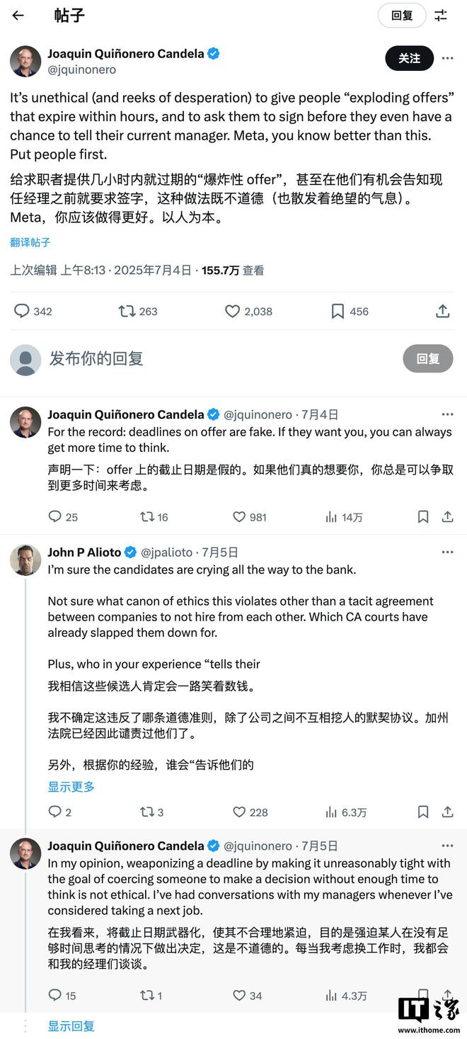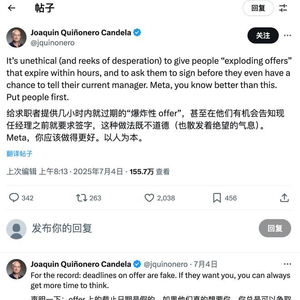 IT之家 7 月 6 日消息,OpenAI 招聘主管 Joaquin Quiñonero Candela 日前在 X 上点名 Meta,批评其挖角方式过于激进。他透露,Meta 向 OpenAI 员工开出高薪职位,但这些 offer 只有短短几小时的有效期,员工几乎没有时间与主管沟通。他直言这种行为“不道德”,并称“让人闻到一股绝望的味道”。