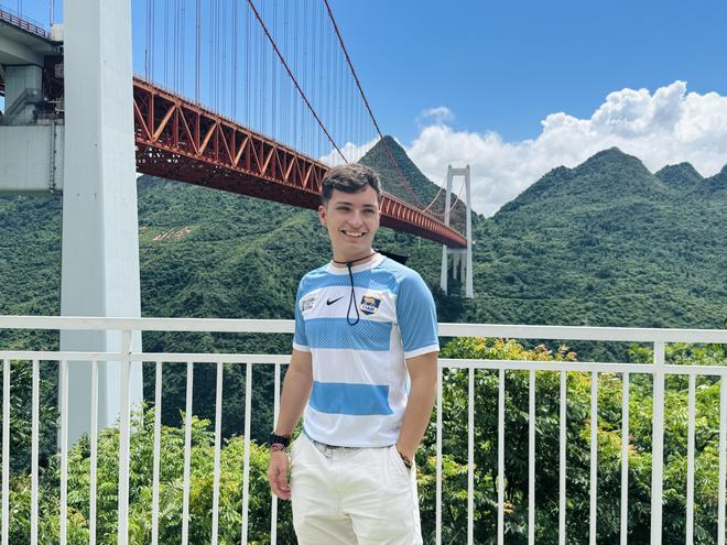 7月3日,在参观贵州省安顺市坝陵河大桥时,来自阿根廷的门多萨气候青年组织联合创始人伊格纳西奥·维拉罗亚与大桥合影留念。新华社记者 周宣妮 摄
