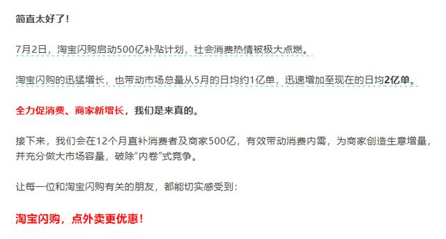 淘宝闪购表示:“接下来,我们会在12个月直补消费者及商家500亿,有效带动消费内需,为商家创造生意增量,并充分做大市场容量,破除‘内卷’式竞争。”