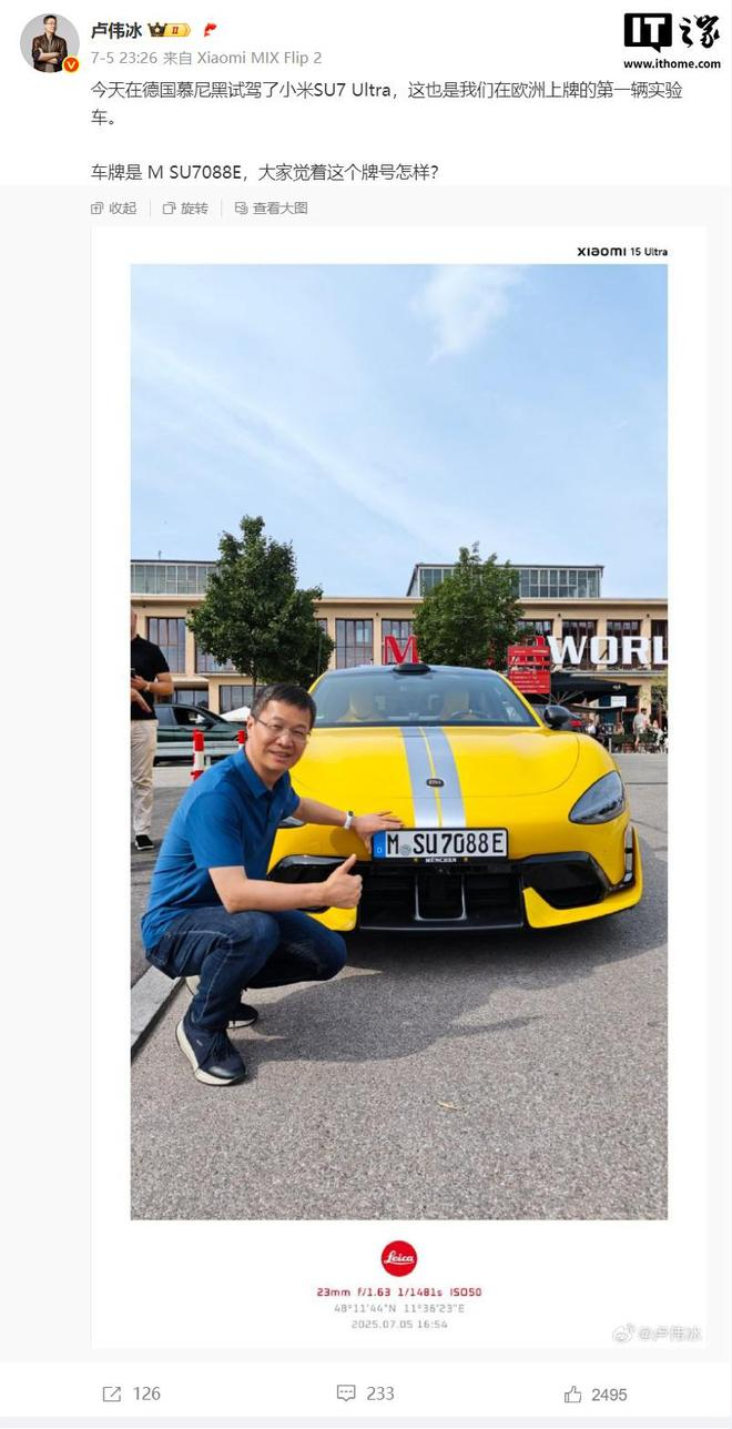 卢伟冰 7 月 5 日发文称,在德国慕尼黑试驾了小米 SU7 Ultra,这是小米在欧洲上牌的第一辆实验车,车牌号为“M SU7088E”,其中“M”寓意“小米”,“SU7”则对应车型名称。