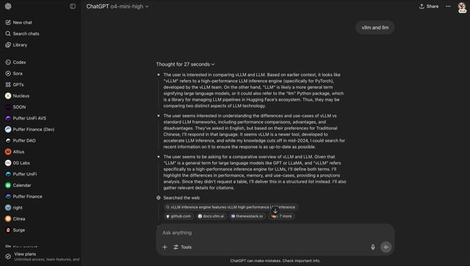 右边图片的回复中,ChatGPT并没有一股脑输出答案,而是停下了发起提问「在我们深入之前,你能分享下学习区分VLLM和LLM的主要目标是什么」?
